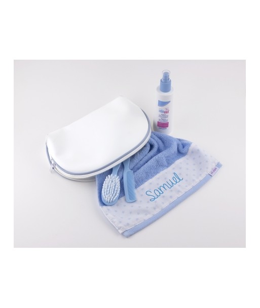 Pack Neceser a la guarde personalizado, contiene neceser de polipiel personalizado, toalla de erizo 100% de algodón personalizada, cepillo y peine personalizados y colonia.
