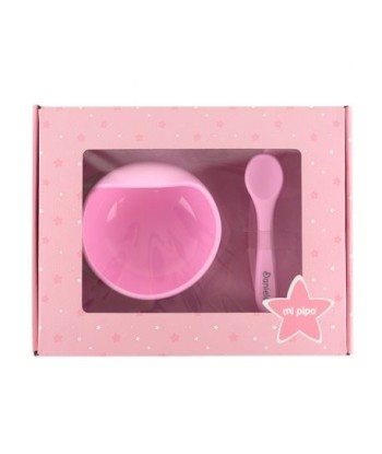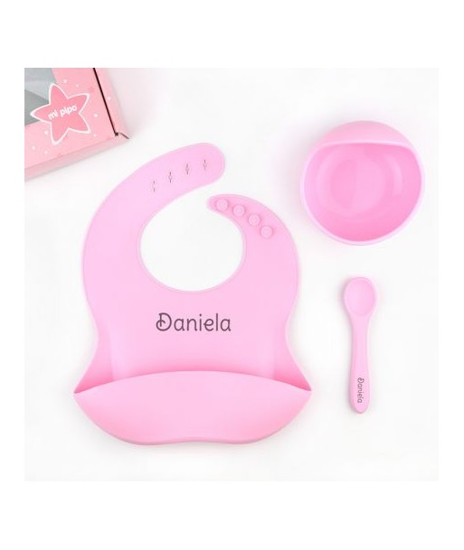 Vajilla con babero, bol y cuchara de silicona Rosa personalizada