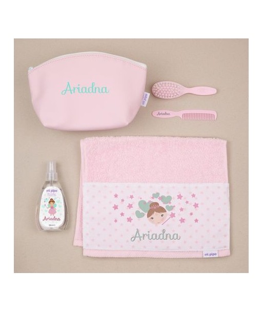 Neceser para guarde hada rosa personalizado, incluye toallita, cepillo y peine, colonia y neceser todo personalizado
