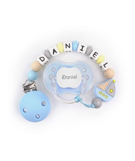 Chupete + Cadenita de silicona Barquito Celeste personalizada